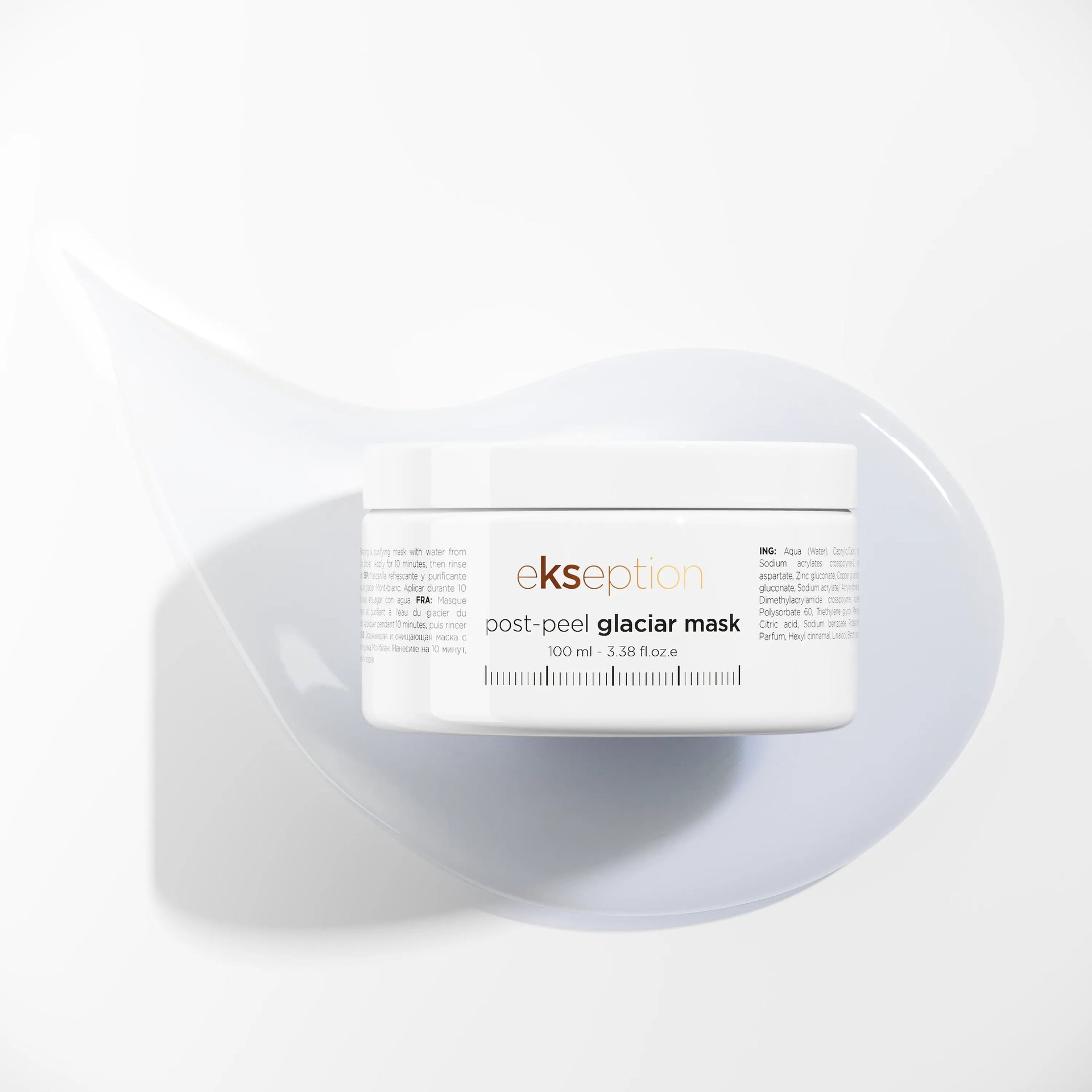 post-peel glaciar mask: An ultra-refreshing mask with a unique glacier texture, specifically designed to soothe and calm skin after peeling treatments, especially oily and combination types. Enriched with minerals and water from Mont-Blanc, it reduces redness, restores mineral balance, and provides an intense cooling sensation.